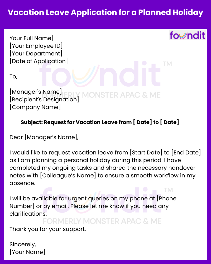 Keep the purpose simple. A short line like “I am requesting leave for a planned vacation” is enough. You do not need to share personal details. - Provide your work plan
